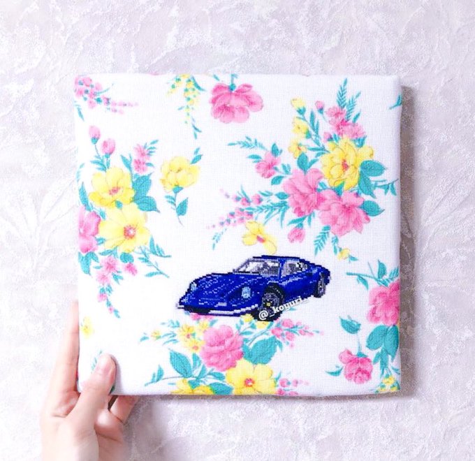 クロスステッチ ファブリックパネル Ferrari Dino🏎 先日の作品にすこし近づいた写真です◡̈* #クロスステッチ #ドット絵 #ファブリックパネル #インテリア #pixelart #pixelartist