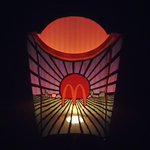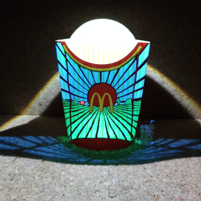ポテトケース切り絵「春は曙、薯は揚げ物」 マックフライポテトの入れ物でステンドグラフ風に。 #切り絵 #ステンドグラス #フライドポテト #マクドナルド #曙光 #cutout #papercraft #stainedglass #McDonalds #frenchfries #sunrise
