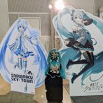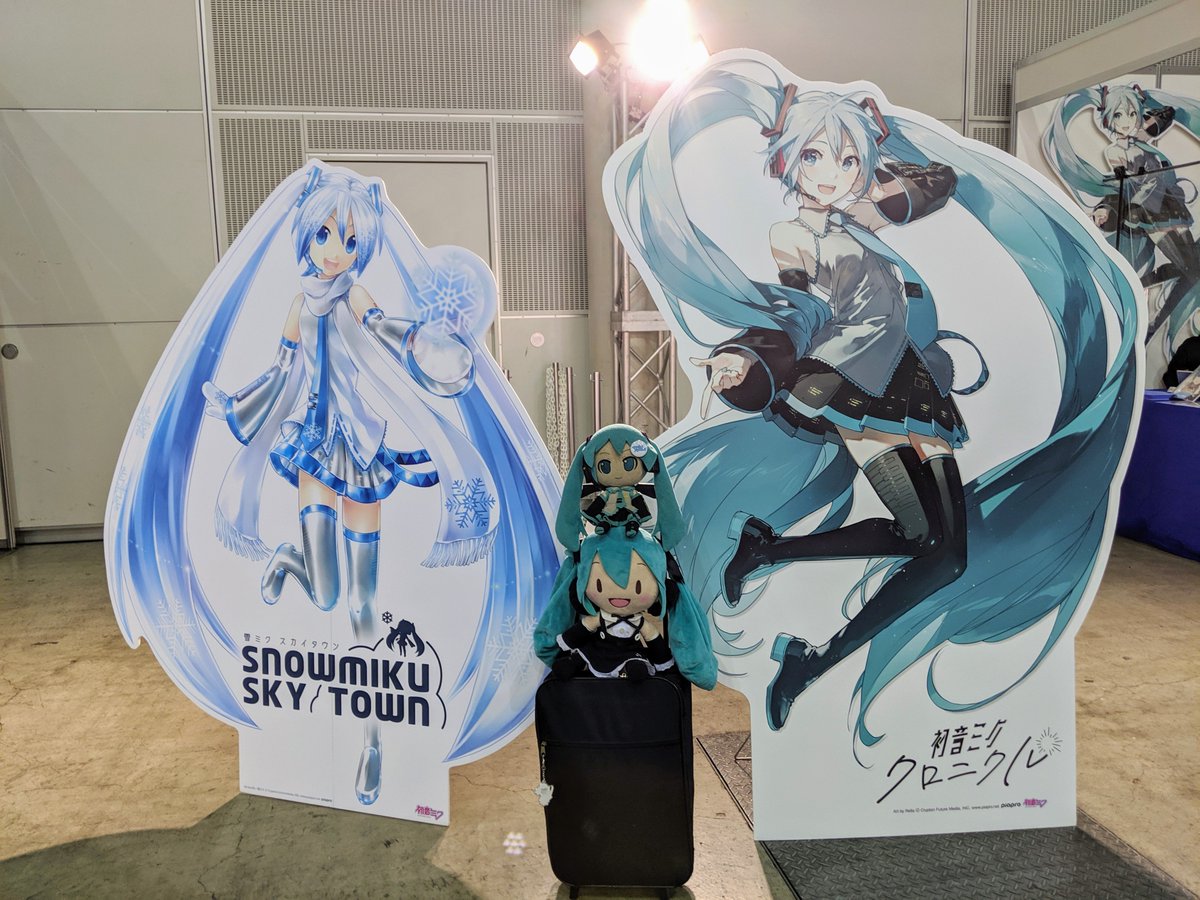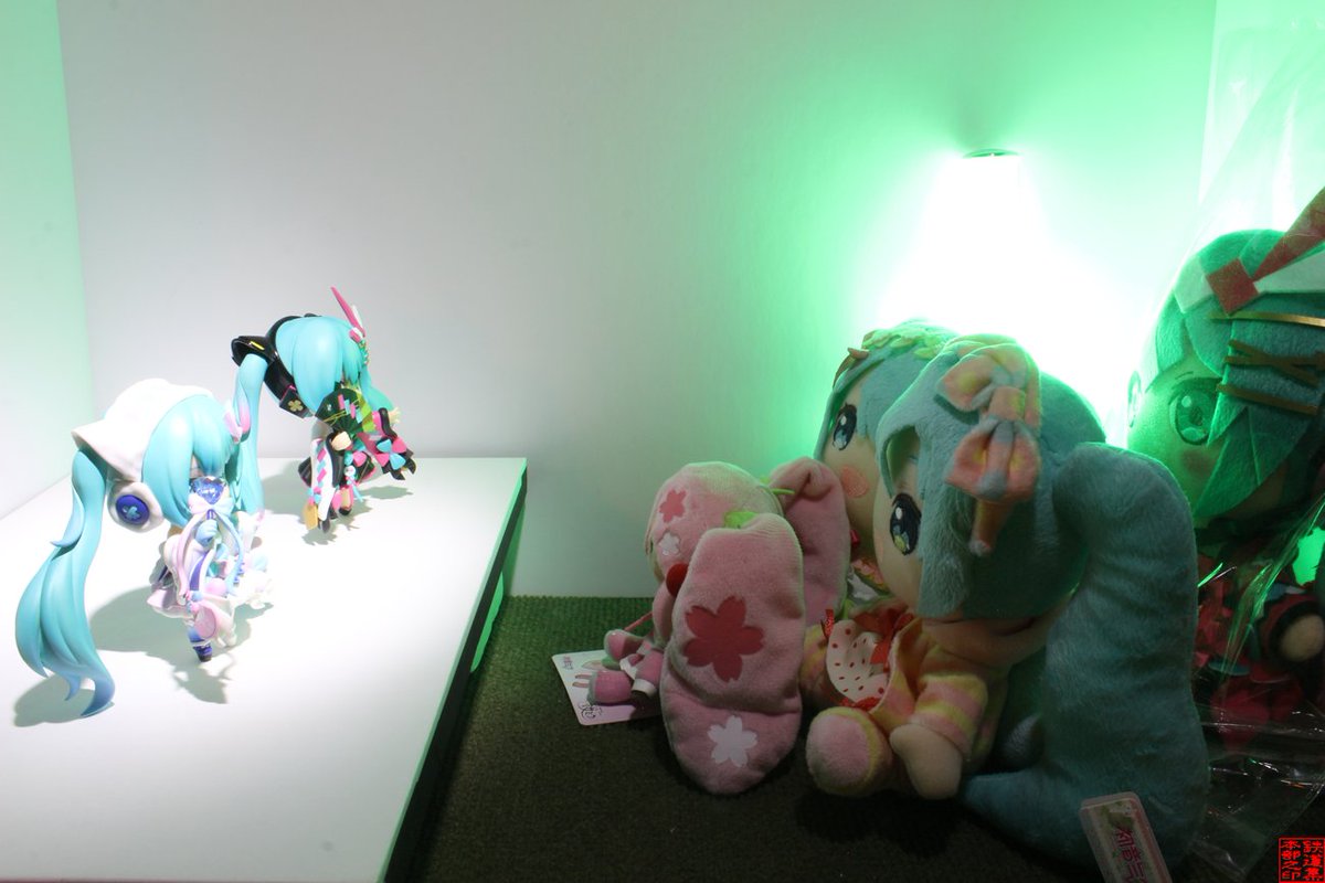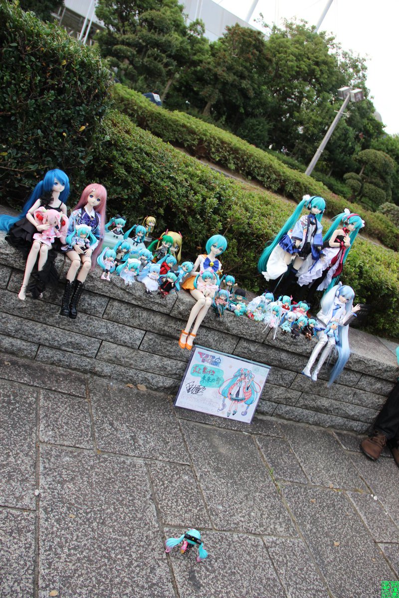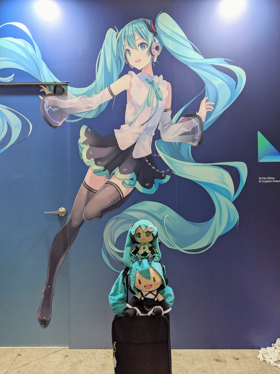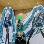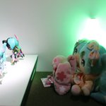 #深夜の初音ミク撮影60分一本勝負 11月7日のお題【フリー】 #マジカルミライ2021 のいろんなブースのパネルのミクさん達とうちの子達とのぱちり。ねんぷらミクさんてMEJふわぬいちゃんの頭に丁度良く乗れるのか。知らなかった。 #ぬいぐるみの時間