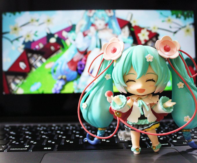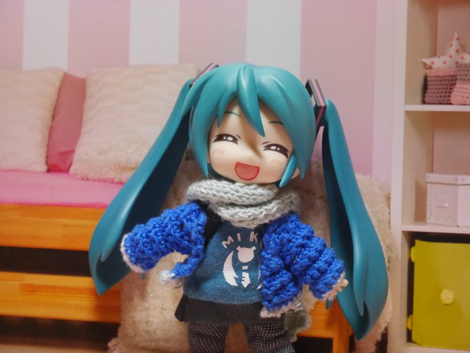 #深夜の初音ミク撮影60分一本勝負 #深夜のねんどろ撮影60分一本勝負 3/9【おいわい】 ミクの日につき、お祝いのプレゼントとして、 春の色のマフラーを編んで巻いてあげたのですが …遅刻した💧 #ミクの日2023 #初音ミク #ねんどろいどどーる