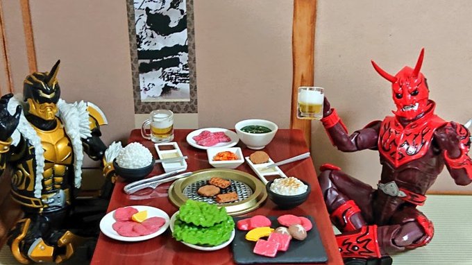 #夜のフィギュア撮影会 お題 肉 #竈門炭治郎 「鬼の匂いがする‥でも普通の鬼と違う‥この鬼‥人の肉を食ってる鬼なのか」 #モモタロス 「なっ💦なんなんだテメェー⁉️急に刀なんか抜いちゃってさぁそれ本物なのか⁉️さてはイマジンだな‼️」 その後‥炭治郎とモモタロスは和解して一時行動を共にする