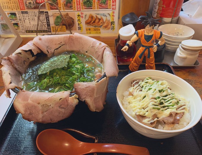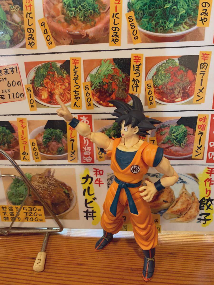 おざます⭐️くねくねマンです😊朝からハイカロリーで胃もたれするツイートすみません🙏😅w 昨日ラーメン食べに行った際、悟空さんも一緒に撮影しました😅#ラーメン #オモ写 #孫悟空 #DRAGONBALL #SHFiguarts #フィギュアーツ