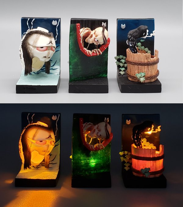 葛飾北斎の光る百物語シリーズもワンフェスで販売致します👻ろうそくの光のようにゆらゆらと光ります🔥🏮 【完成品】 お岩提灯10,000円 こはだ小平次、皿屋敷、各30,000円 【ガレージキット】 こはだ小平次、皿屋敷3,000円 #ワンフェス2023冬 #WF2023W