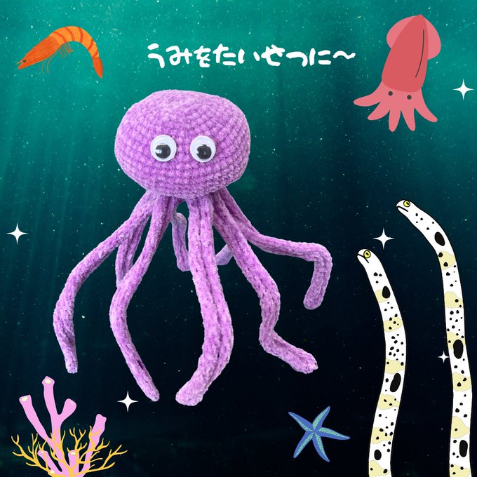 6月8日の #世界海洋デー にちなんで、#あみぐるみが編みたくなる糸 で編んだタコ🐙をご紹介♪ 頭部は #1玉くまちゃん のレシピで、足は「アイコード ニッター」でくるくると2メートル超のアイコード(筒)を作り、中にアルミのワイヤーを通して折り曲げてみました。 オクトナス🍆君。雄です😉(A-yi)