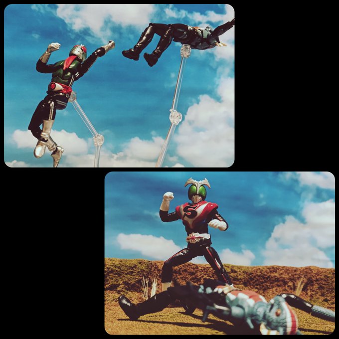 おはようございます☀️ スカイライダーとストロンガーのダブルキックって胸熱 ですよね( ´∀`) #仮面ライダー #仮面ライダーストロンガー #スカイライダー #九人のライダー #掌動 #shodo仮面ライダー #特撮 #オモ写