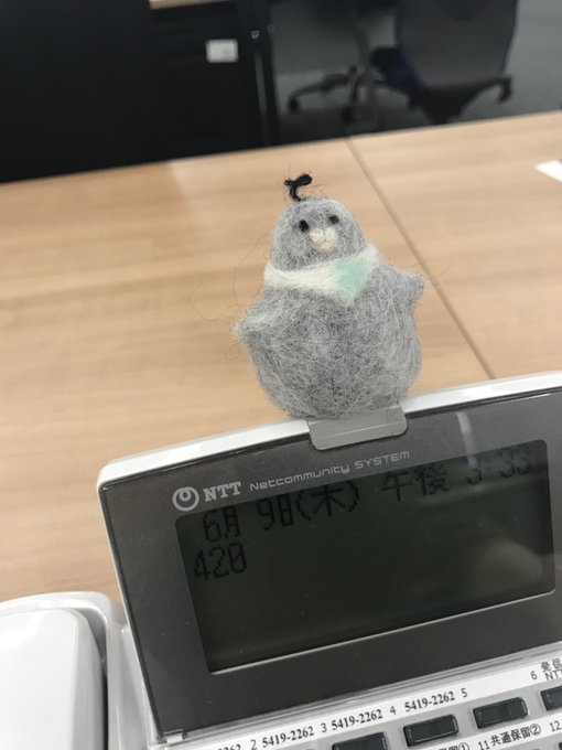 はっっ!!! 電話機の上にちっちゃいぼくがいるぽ🐦 だれかが #羊毛フェルト で作ってくれたみたいだぽ… 頭の「と」までちゃんと再現されてるぽ〜✨ #手作り #ハンドメイド #企業公式つぶやき部 #企業公式夏のフォロー祭り