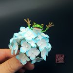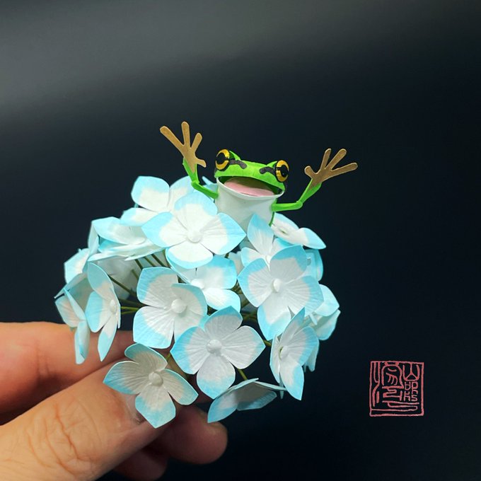 #作品をみてくださいあわよくばフォローしてください祭 半分に折った紙をハサミで切って立体にする切り折り紙で花とカエルなどの小さな生き物の暮らす小さな風景を作っています。 無表情な生き物を表情豊かに作ります。下絵なしで作るので個性豊か。 あなたには作品からどんな物語が見えますか?