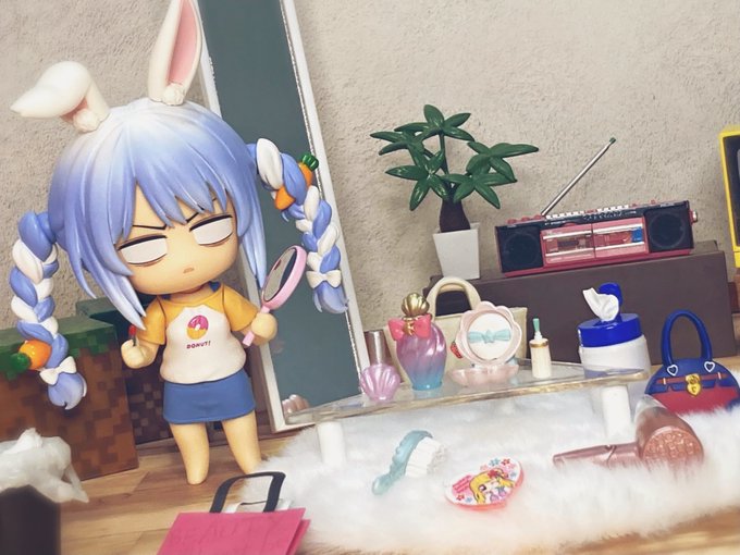 #深夜のねんどろ撮影60分一本勝負 【7/4のお題 さがす】【遅刻】 ぺこら『どど、ど、どうしてペコ...盛れば盛るほど、遊郭編の善逸みたくなるペコ...。』 新作コスメを使って自分を『探す』途中、迷子に(*´ω`*) #兎田ぺこら