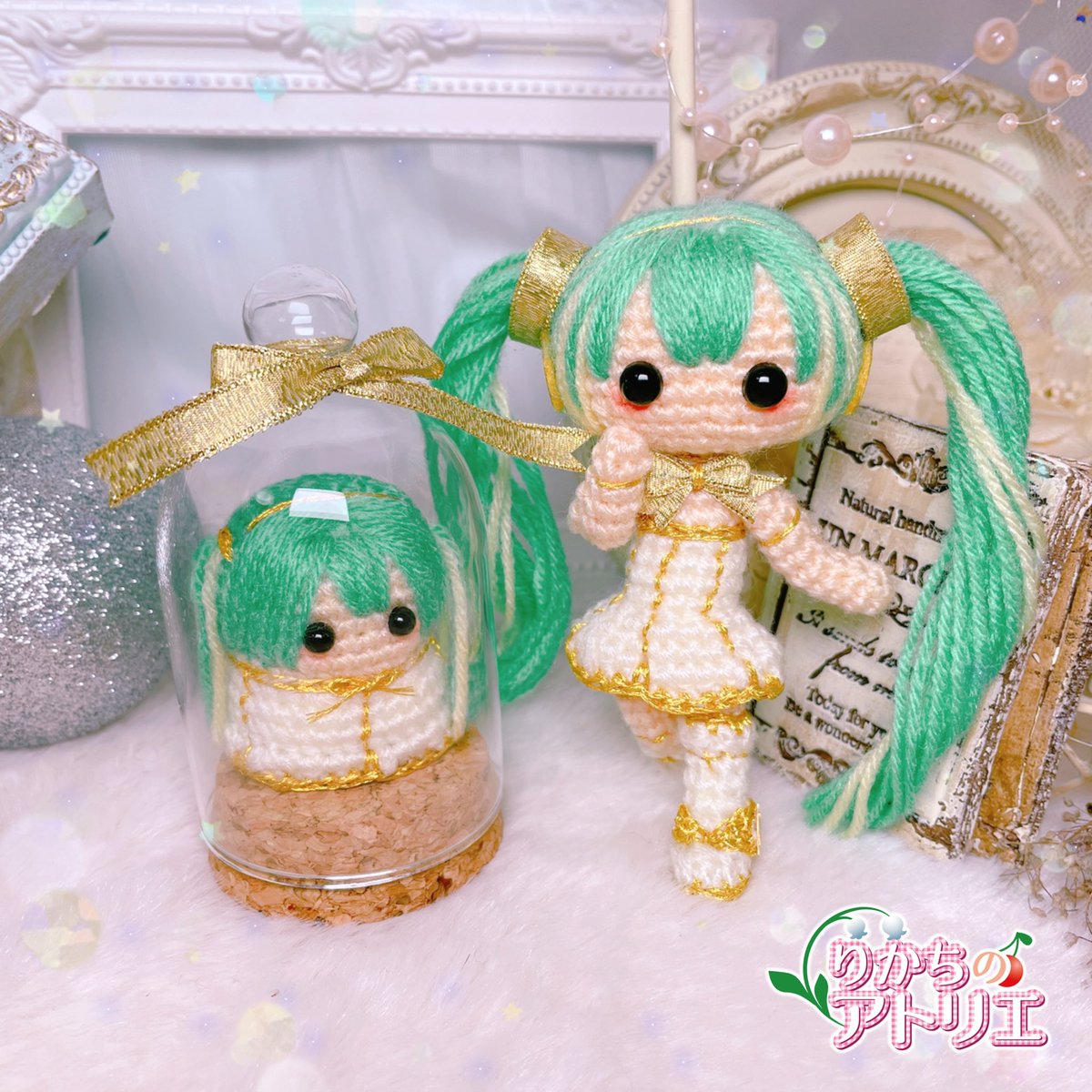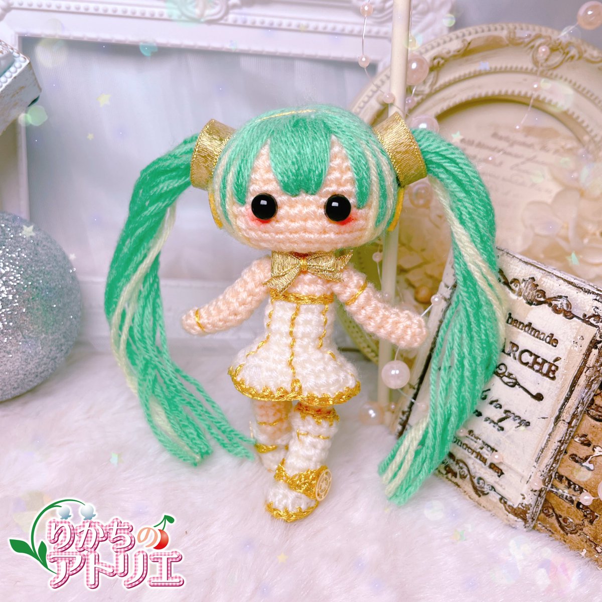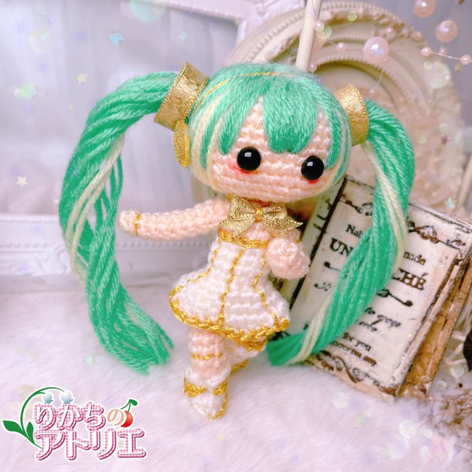 初の初音ミクシンフォニー…むちゃくちゃ感動したなぁ🥲✨ って事で、初音ミクシンフォニー 蓄音機ミクさん完成しました( *˙ω˙*)و💕 ゴールドの糸でとっにかくキラキラ✨ 顔周りの髪の毛はグラデーションっぽく見えるようにしてみました…☺️ #初音ミクシンフォニー #りかちのアトリエ #あみぐるみ