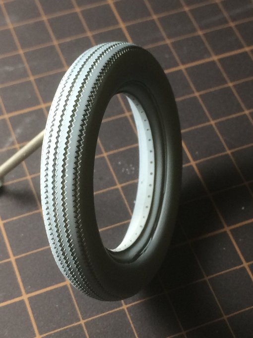 #唐突に5年前の写真を載せる見た人もやる スーパーカブのカスタムを作ってました! まだ3Dプリンタも無かったので、1/12ファイアストンタイヤを作るのに四苦八苦。0.3mmプラ板で作った6枚のギザ帯をスリックタイヤに貼って、その間隙で5本のギザ溝を表現…とかしてましたよ。やるなおいら!(๑˃̵ᴗ˂̵)
