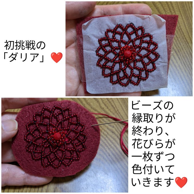 最近、刺繍糸の魅力にも取り憑かれ、今までビーズだけでは難しく断熱していたことにも挑戦中です👍 今日は「ダリア」✨ 縁取りだけでも、綺麗に仕上がりましたが、これから花びらに色を付けていきます😊❤️ #夏の創作クラスタフォロー祭り summerpeach's GALLERY #minne minne.com/@abibubagon