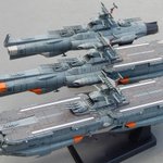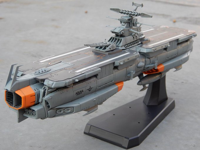 1/1000航宙母艦【フューリアス】 アスカの後半分同士を繋いで全通甲板空母風に。 パテは一切使わない。 艦尾が艦首に見えるよう波動砲を埋め込み誤魔化して。 無塗装・スミ入れ・デカール(アスカのまんま!)のみで此処まで出来ます。 皆さんも是非お試しあれ! #宇宙戦艦ヤマト立体・イラスト作品集