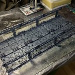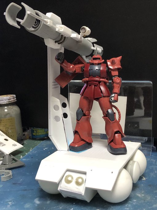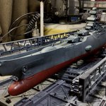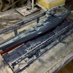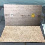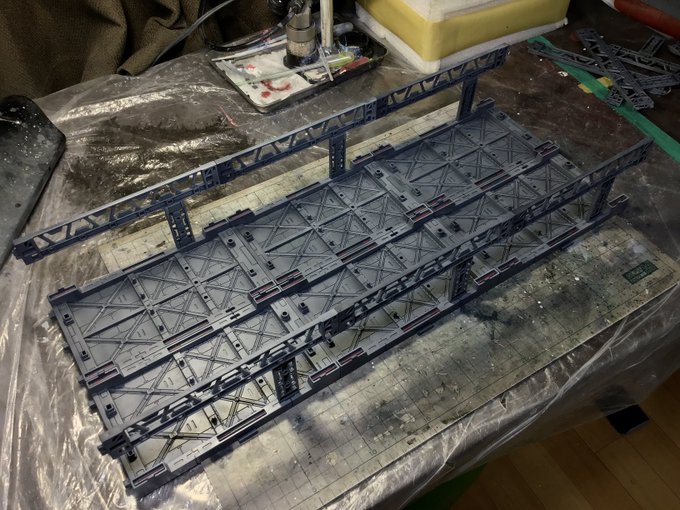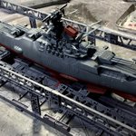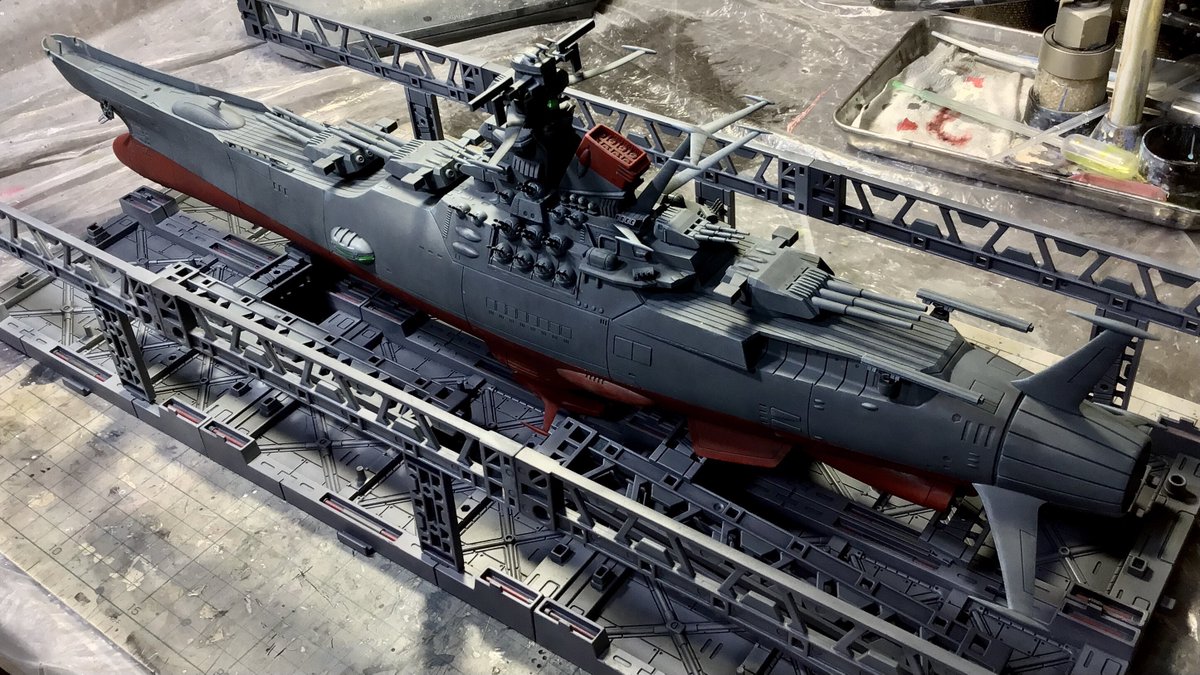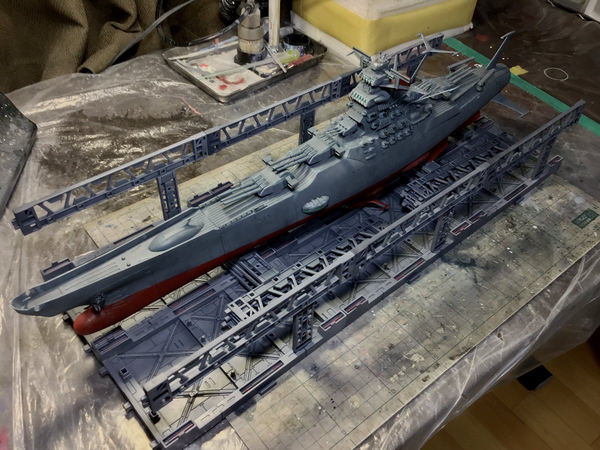 これは素直に床に敷いた構成。263mの1/500ヤマト置くとこんな感じ。やはり枚数が欲しい(塗装大変だけど)。ヤマトを支えてる土台はやっつけです。きちんと作れば結構いい展示になるのではと思います。#ディスプレイベース #100均 #山田化学