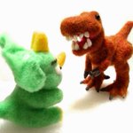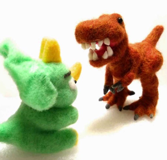 で、出ました~😱💦 #ティラノサウルス の #ぬい 登場❗❗❗ トリトリたち、仲良くできるかしら❓😰 #トリトリと #恐竜ライフを楽しむ毎日 #企業公式ぬい撮り部 #羊毛フェルト #写真 #写真好きな人と繫がりたい #キャラクター #character #triceratops