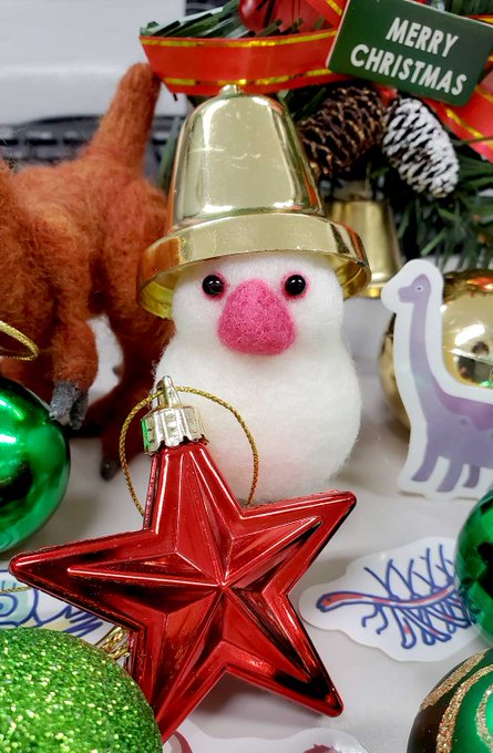 何気に一番乗り気だったプテ姉さん🐤🔔 実はパリピだったのね…🤣 みんなパーティ気分やけど、明日Twitterマンガ更新の日やで~😅📣 Are you ready❓❓😎✨ #トリトリと #恐竜ライフを楽しむ毎日 #企業公式ぬい撮り部 #羊毛フェルト #写真 #文鳥 #クリスマス2022