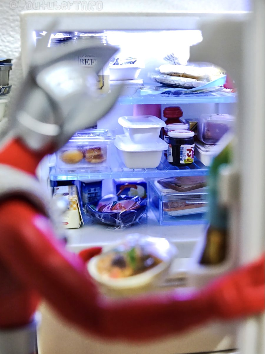 冷蔵庫の中身とか、最近いろいろ忘れっぽくて(><) 買い物も献立も(たいした料理は出来ないが)計画的にしなくては😵 ウチの食品ロス削減のため、冷蔵庫に入らなかったものはお腹へ入れた♡ #オモ写 #toyphotography #ウルトラマンタロウ #料理 #miniature #food #冷蔵庫 #残り物 作り置き 買い置き