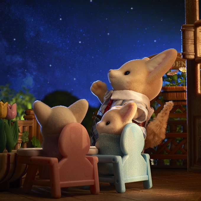「見て!流れ星だよ!」 みんなで天体観測中に流れ星を発見! フェネックのふたごちゃんたちも嬉しそうです✨ 「…あ!願い事し忘れちゃったよ~」 願い事はまた流れ星をみつけるまで、おあずけですね🌟 #シルバニアファミリー #シルバニア #天体観測 #星 #星空 #シルバニア赤ちゃん