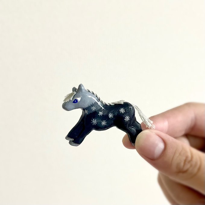 星空の馬のブローチ、完成しました! 旅の途中に訪れた星が体の模様として残り、銀色に輝いています🐎💫 石粉粘土と刺繍糸を組み合わせて制作しました🙌🏻✨ #春の創作クラスタフォロー祭 twitter.com/heiwa_record/s…