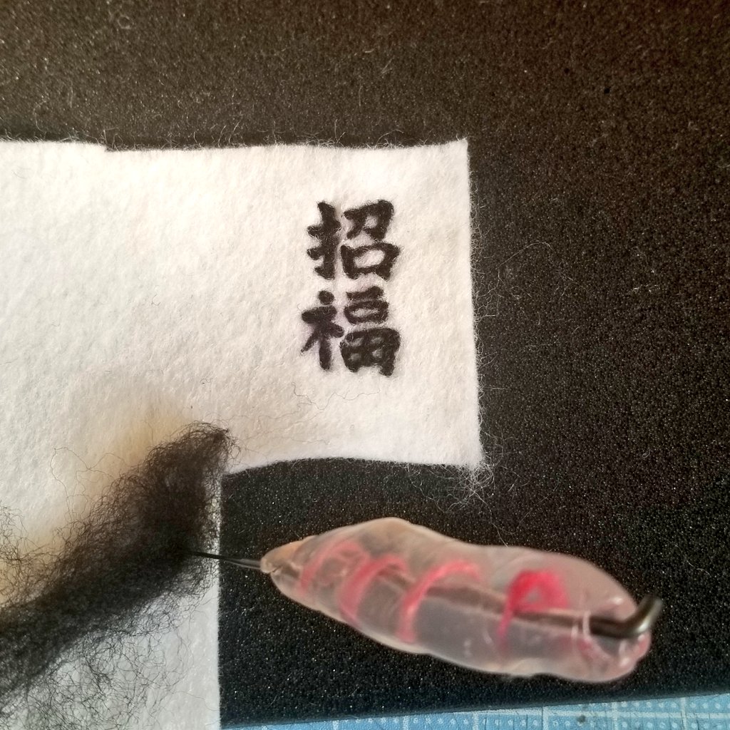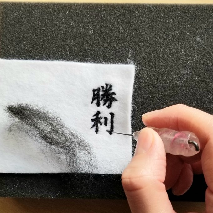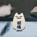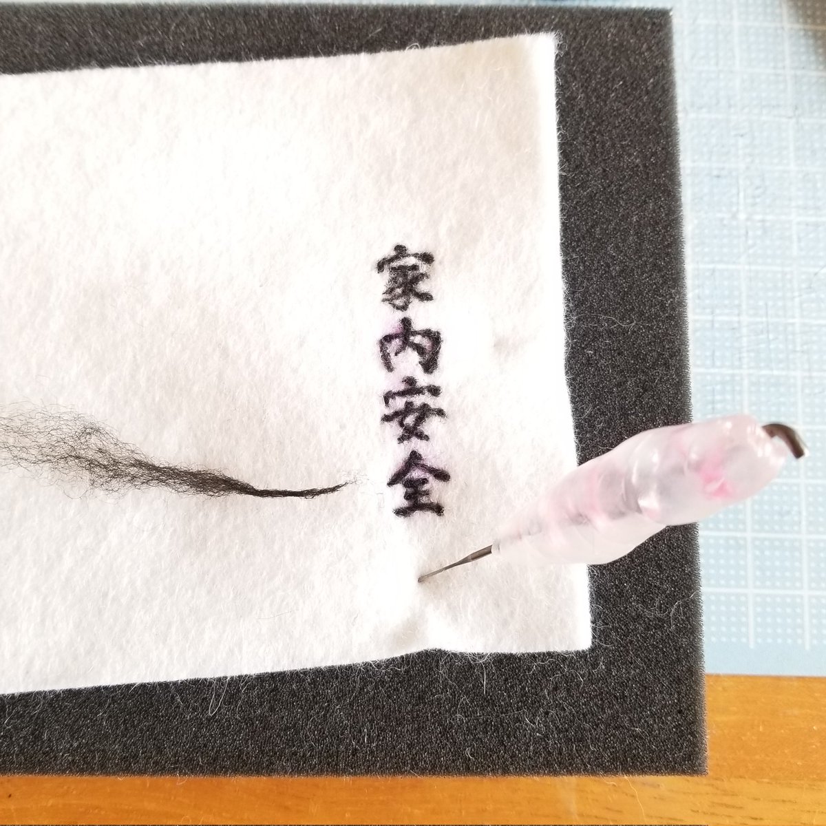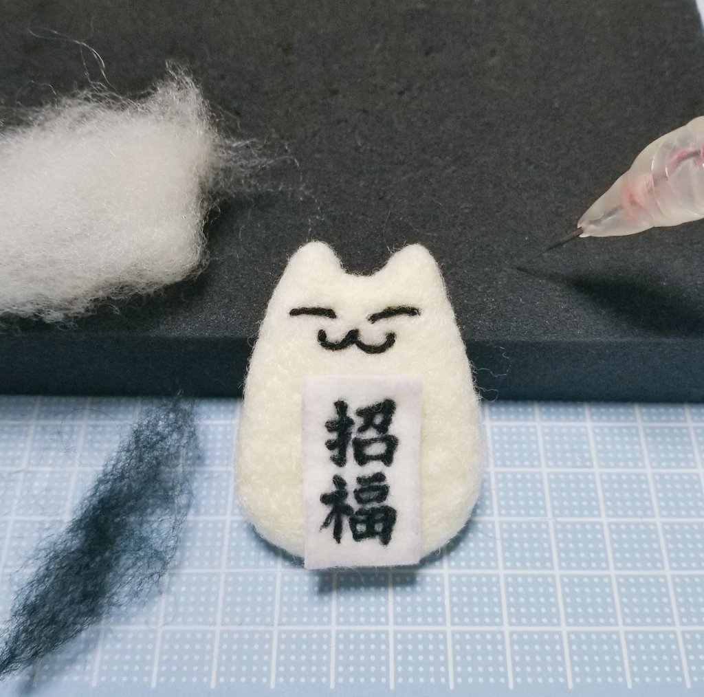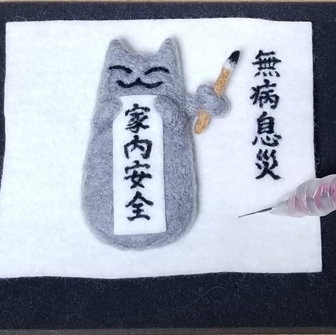 お習字ねこ三兄弟 やっぱ画数多いと字自体を大きくせざるを得ないです😅 無病息災ねこ2匹めは風邪引き真っ只中の両親の元へお見舞いに行ってもらおう #羊毛フェルト #書道 #ハンドメイド好きさんと繋がりたい