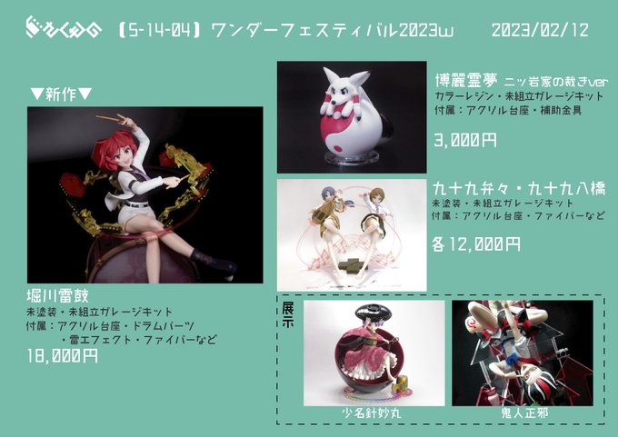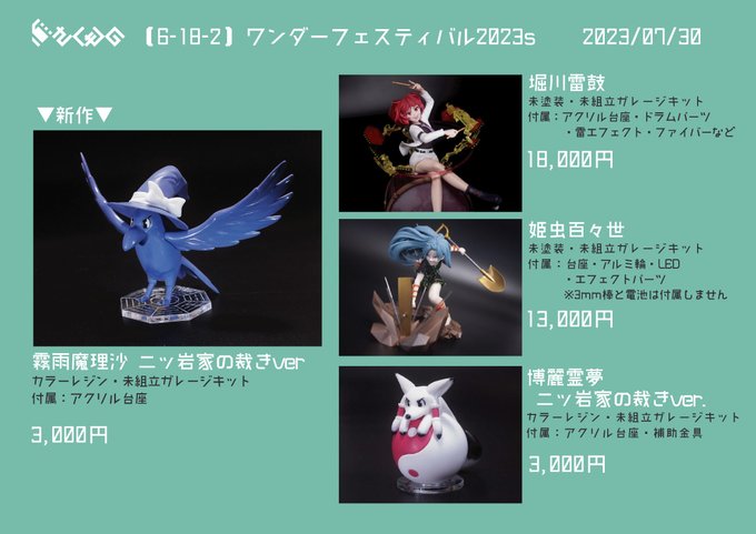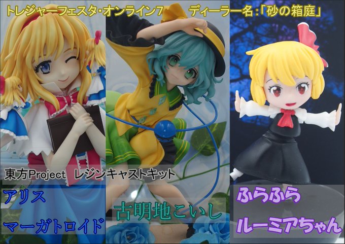 【告知】 トレジャーフェスタ7のお品書きです。 東方プロジェクトより、以下を販売させて頂きます。 ・「古明地こいし」1/6サイズ ¥17000 ・「アリス・マーガトロイド」1/4サイズ ¥20000 ・「ふらふらルーミアちゃん」ノンスケール¥6000 #TFO7 #トレフェスオンライン7 #東方