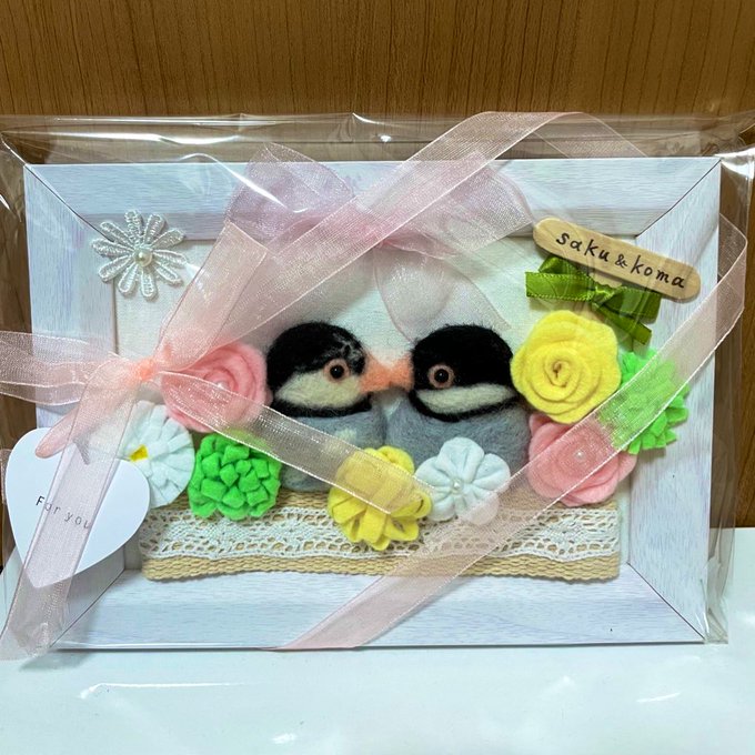 先日@Shiningtree4 さんにオーダーしていたフレームが届きました❣️ お願いしていた通り再現していただきありがとうございました😊 とても可愛いです💕 早速玄関に飾らせてもらいます🖼 3枚目がモデルになった写真です❣️ #桜文鳥 #羊毛フェルト twitter.com/Shiningtree4…