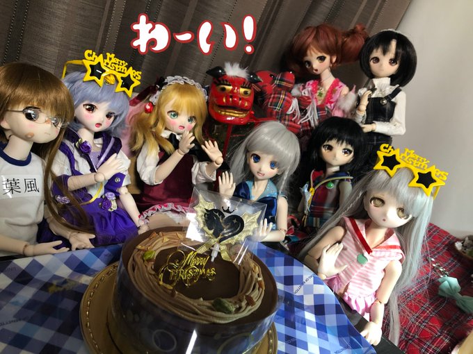 ウチの子ら「#メリークリスマス!」 #ドールでクリスマス #ノードール・ノーライフ #今夜のドール撮影120分一本勝負 #うちのこに癒され24時間 #深夜のドール撮影素敵文1440分1本勝負 #デレマスドール部 #橘ありす #久川凪 #櫻井桃華 #輿水幸子「って獅子舞の絵面が強すぎま…よく見たらツリー?!」