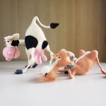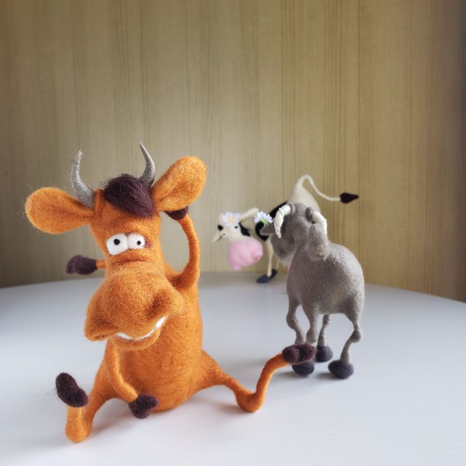 セクシーな牛ちゃん 「私の可愛い尻尾で扇いであげるわ」 巻き角の山羊さん 「おぉ……お嬢さんありがとうなぁ」 セクシーな牛ちゃんはminneで販売中です。 #羊毛フェルト #牛 #minneで販売中