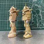 #白背景でも撮ってみた カラーレシピは引用元に😭 両肩をスパイク化、寄せ集めパーツで左前腕にショートバレルガトリング😭 缶スプレー×マスキングシートによるスプリッター迷彩・・・実は上腕と太腿だけ色の組み合わせが違います😏 #ガンプラ #GUNPLA #HGTO #ザク #デザートタイプ #砂ザク twitter.com/gajumaru_museu…