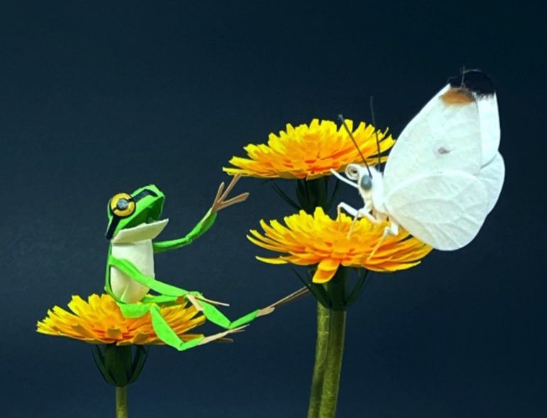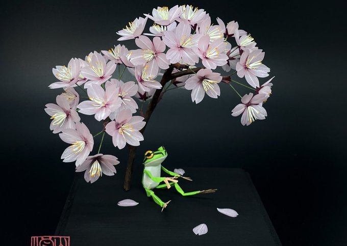 #私の個性はきっと誰かにささる 半分に折った紙をハサミで切り抜いてから折ったり曲げたりして立体にする切り折り紙で、季節の花々とカエルなど小さな生き物の暮らす小さな風景を作ります。 弱肉強食のない平和な世界が広がっています。 twitter.com/yamshis_works/…