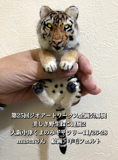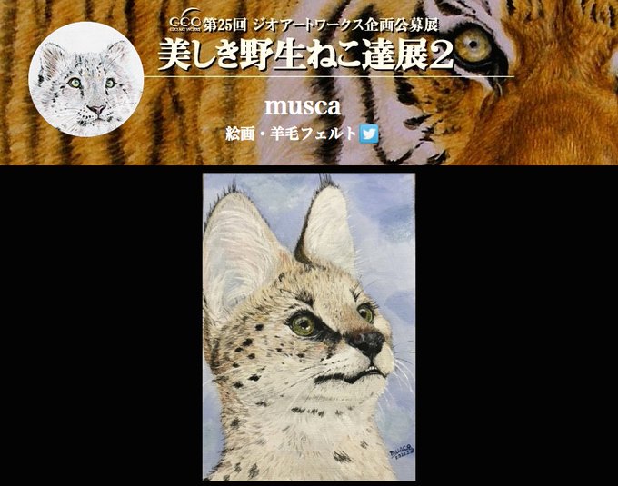第25回ジオアートワークス企画公募展 🐯#美しき野生ねこ達展2🦁 大阪中津くまのみギャラリー11/26-28 〈作家13名様ご紹介Q&AをHPに掲載〉 作家様ご紹介 muscaさん@musca_zoolife #絵画 #羊毛フェルト #ネコ科 hookjawgeoartworks.web.fc2.com/wildcats2/wild…
