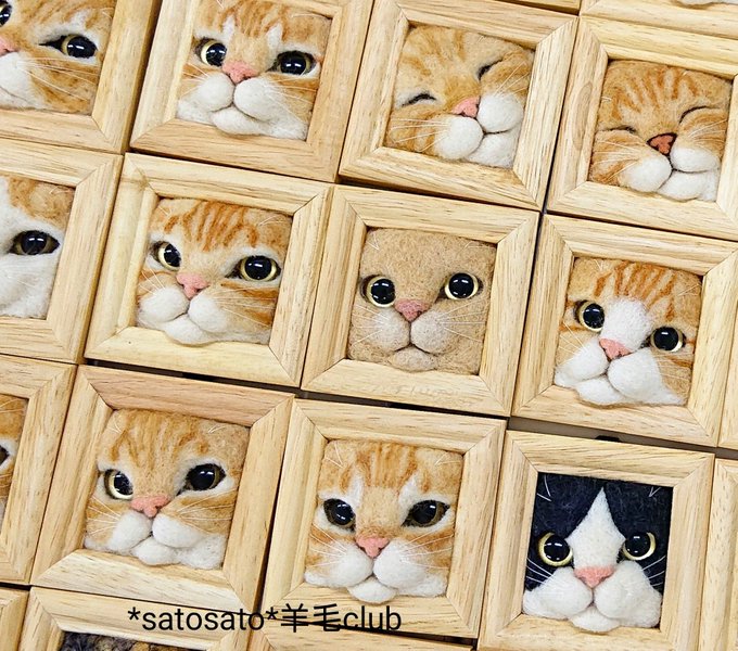 昨日の #タブル猫フレーム と通常版の大きさ比べ🐱 実は目の大きさは一緒のものを使ってるから、タブルは比重的にお目々大きめで仔猫風になります♪ ※右の #茶トラ は 既出の #ねこ休み展 に行く予定の子です。 #羊毛フェルト #猫フレーム #ねこ休み展夏2022(浅草橋) #猫好きさんと繋がりたい