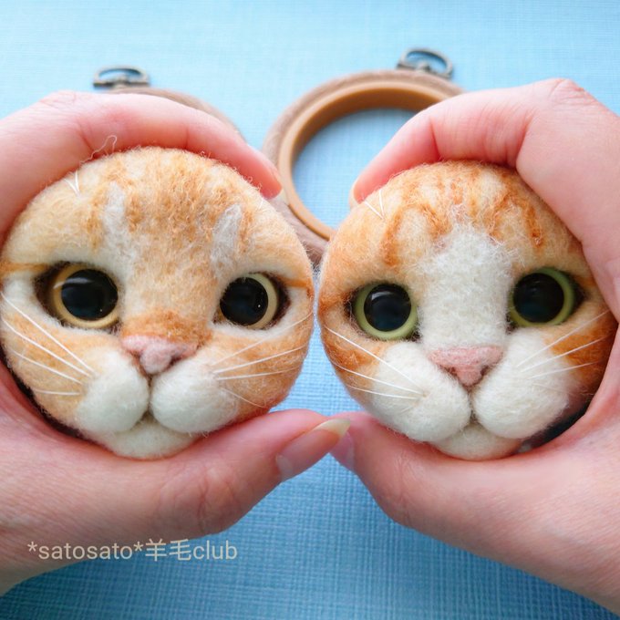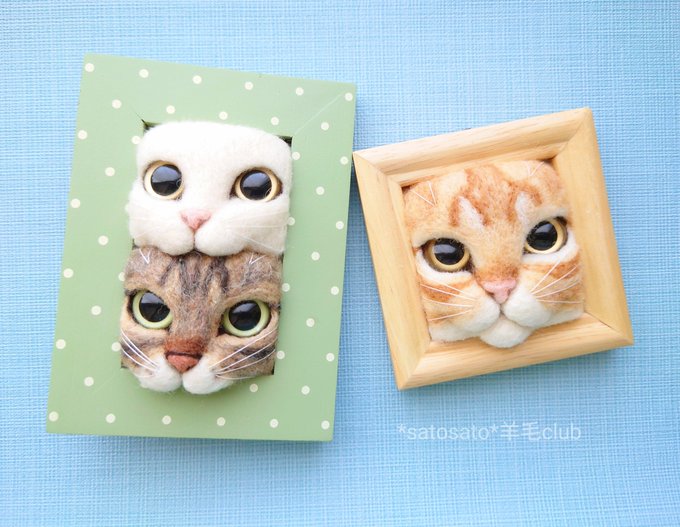 昨日の #タブル猫フレーム と通常版の大きさ比べ🐱 実は目の大きさは一緒のものを使ってるから、タブルは比重的にお目々大きめで仔猫風になります♪ ※右の #茶トラ は 既出の #ねこ休み展 に行く予定の子です。 #羊毛フェルト #猫フレーム #ねこ休み展夏2022(浅草橋) #猫好きさんと繋がりたい