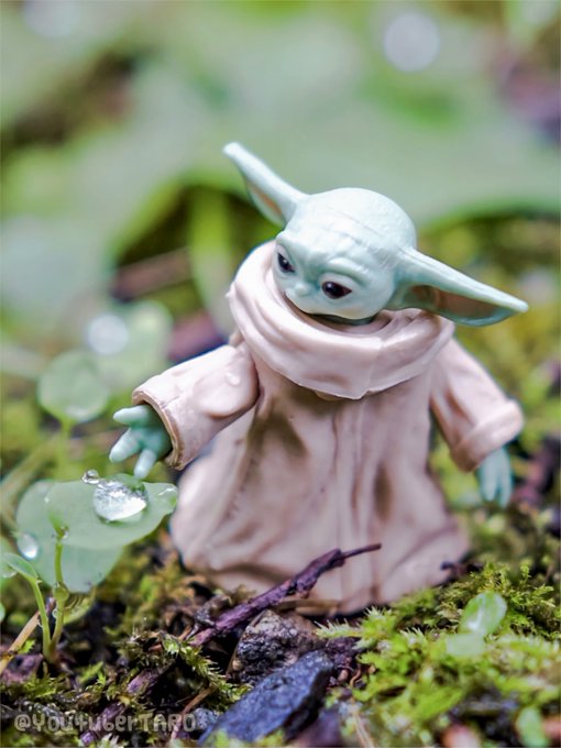 #夜のフィギュア撮影会 9/13 お題「フリー」 雨粒 💧🌿 raindrops (既出) #オモ写 #toyphotography #Grogu #Mandalorian #StarWars #グローグー #マンダロリアン #スターウォーズ #raindrops #rain #雨粒 #雫 #雨