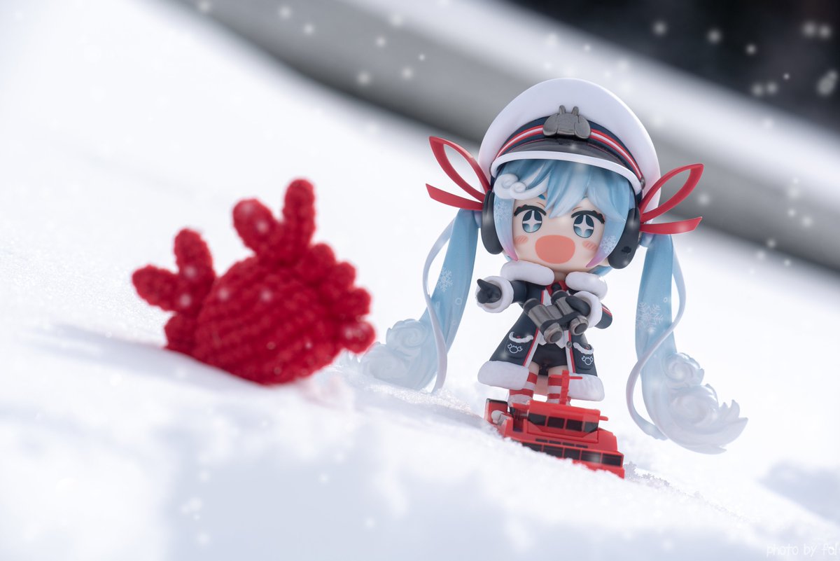 2/28のテーマ【こんげつのしゃしん】【過去】【既出】 今月の主役はカニ船長雪ミクさん! 「れっつご〜っ♪」 冒険家過ぎる天候だった… #深夜のねんどろ撮影60分一本勝負 #みくさんぽ #雪ミク2022 #Snowmiku2022