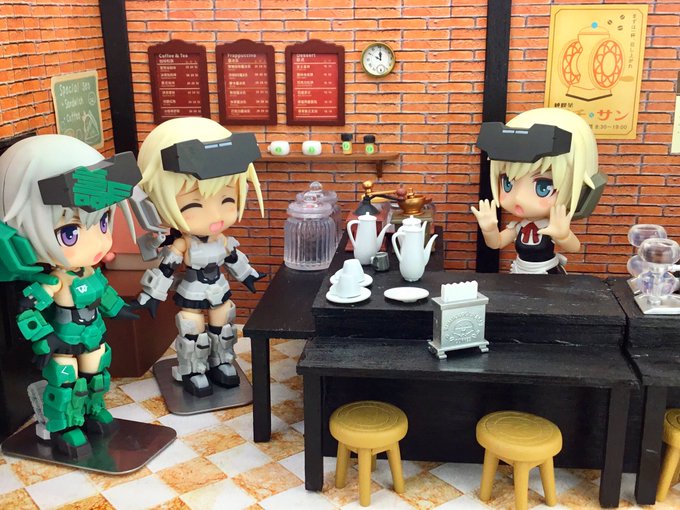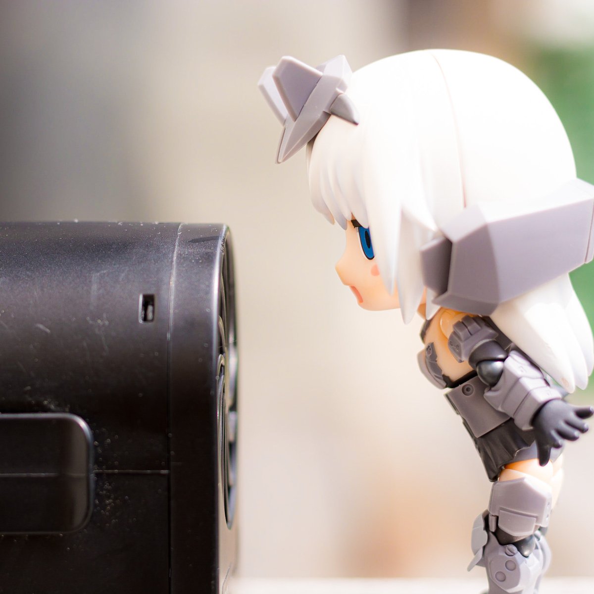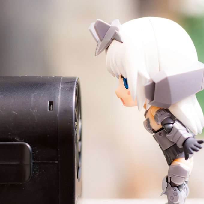 #夜のフィギュア撮影会 #キューポッシュ #フレームアームズ・ガール #FAガール 【7/31 お題 『開発』】【既出】 「おー、ちっちゃ可愛い❗️」 「私達のデータを素に作ったみたいよ。開発部も面白いもの作るわね〜🎶」