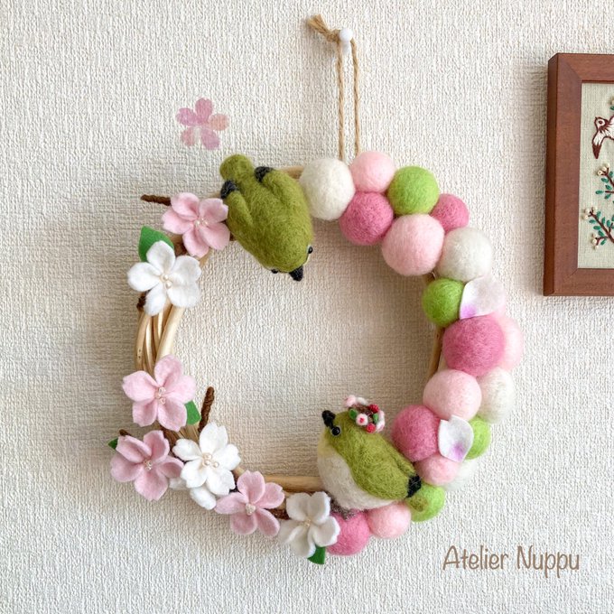 ・:*+. 新作 .:+ 桜とメジロたちの春色リース🌸 今年も桜が満開に咲いたよ これからもきみと 毎年桜を一緒に見たいな 〜〜〜〜〜〜〜〜〜〜〜 メジロは夫婦愛が強く、一度つがいになるとその関係は、生涯続くこととなるそうです #羊毛フェルト #ハンドメイド #minne_new #TLを花でいっぱいにしよう
