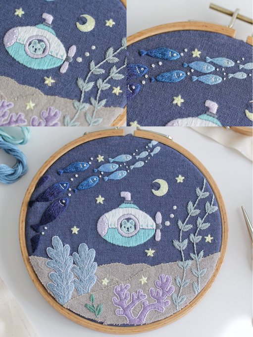🫧潜水艦のブローチ(星海探検)🌟 新作のブローチが完成しました! 以前壁飾りとして作った作品が元になっています🌊 壁飾りと同じ配色のものと、全体をイメージしたものと両方作ってみました。 クリマに持っていきます! #刺繍 #ハンドメイド #クリエーターズマーケット