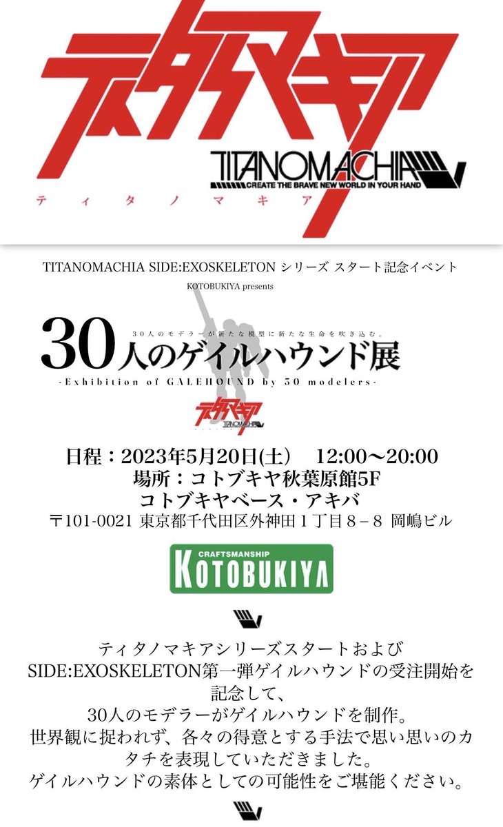 #ティタノマキア #ゲイルハウンド #30人のゲイルハウンド展 昨日の展示が大好評につき、本日も開催延長されるそうです(^^)/ 見逃してしまった方は、このチャンスをお見逃しなく! 2023年5月21日(日) 12:00~20:00 コトブキヤ秋葉原館5F twitter.com/i/web/status/1…