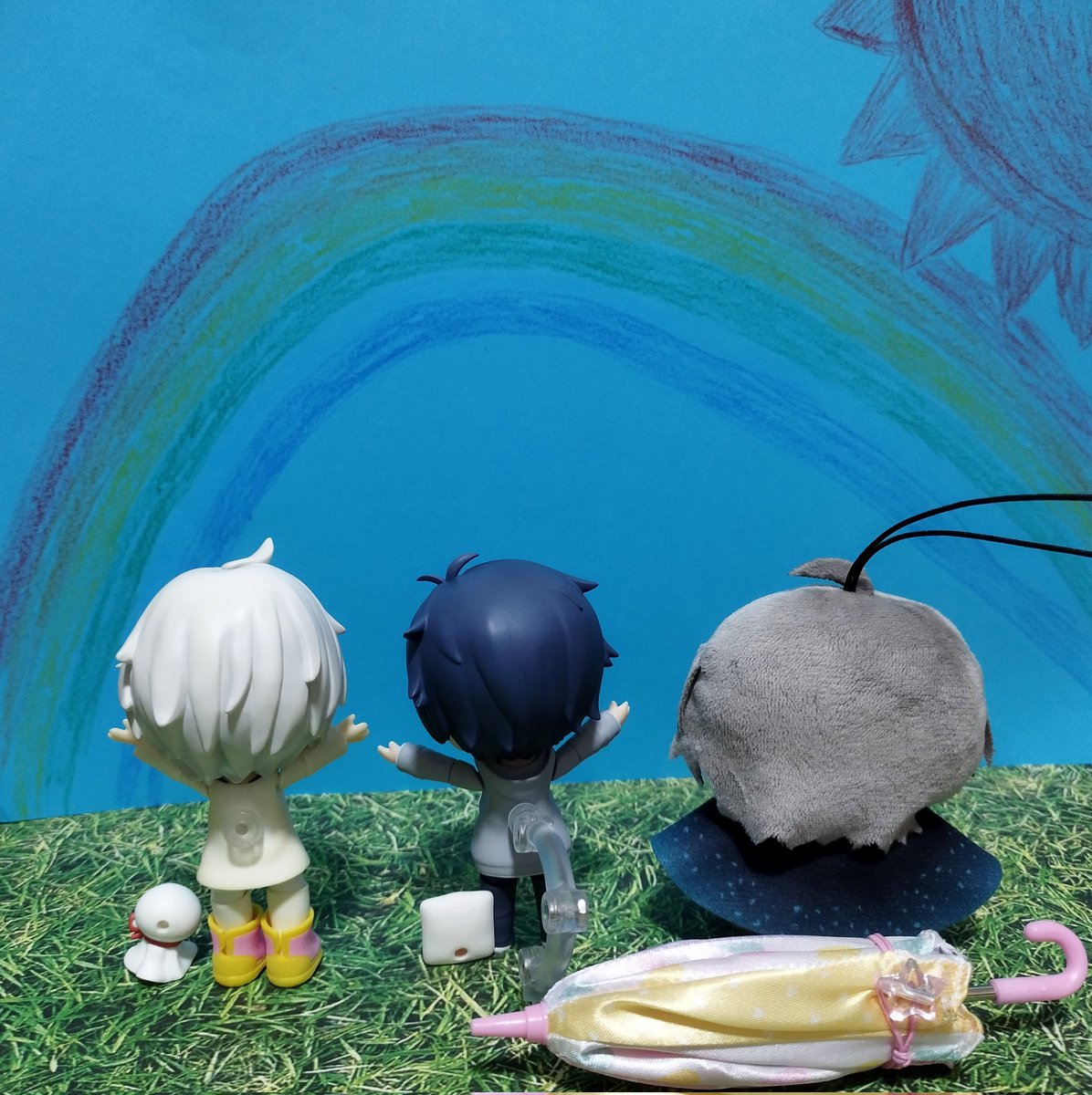 お題「あめ」フライング 雨上がり☔🌈晴れた!!🌞 #深夜のねんどろ撮影60分一本勝負 #まふまふ #そらる #甲斐田晴 #ぬいぐるみの時間 #にじぱぺっとが見られるタグ #にじぱぺっと #AftertheRain