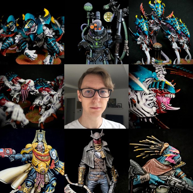 In case any of you were really interested in my dumb face, here I am along with some of the things I’ve painted this year :) #artvsartist2022 #WarhammerCommunity #40k #PaintingWarhammer #Warhammer40k #Brushstrokes #Warmongers #Bloodborne