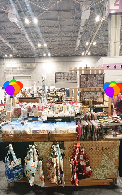 #arteVarie #スパコミ 設営完了いたしました🎪 会場▶東京ビッグサイト スペース▶B24(東2ホール) 本日15:00まで会場でお待ちしております。 ぬいぐるみと一輪挿し、ブローチ、手描きの巾着袋&ミニトートバッグを沢山並べました🌟 久しぶりに制作したブローチは約50種類以上ご用意しています。