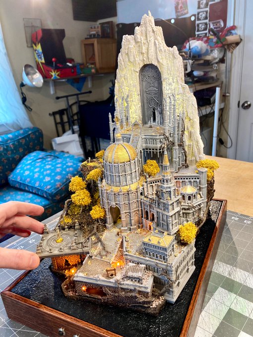 okay Leyndell! I’m off to play with Isaac Clarke now, final photos tonight Collision #1: Leyndell Royal Capital made primarily with paper (also clear resin, bits of basswood, toothpicks, floral wire, wool batting, tea leaf grounds) #ELDENRING #EldenRingArt #EldenRingFanart