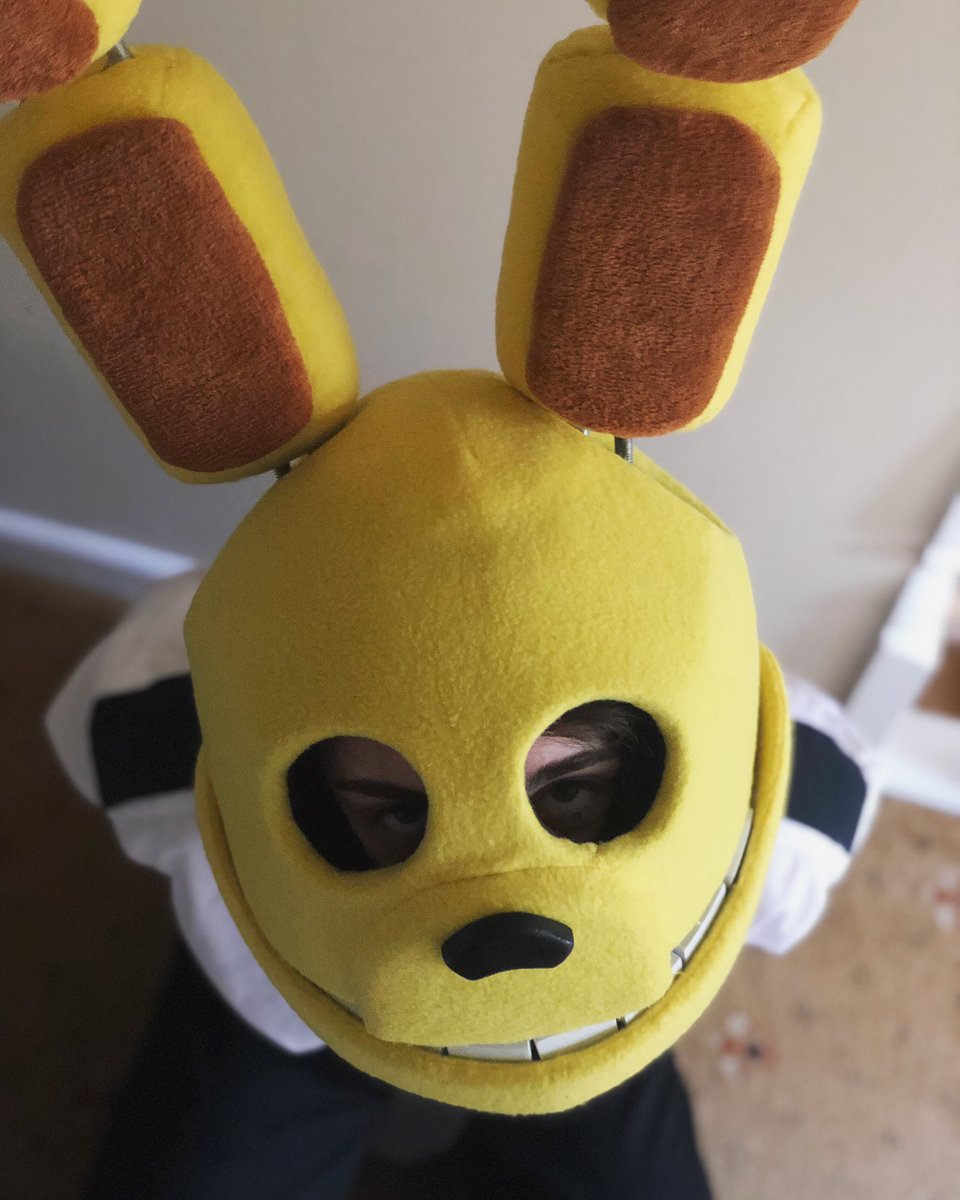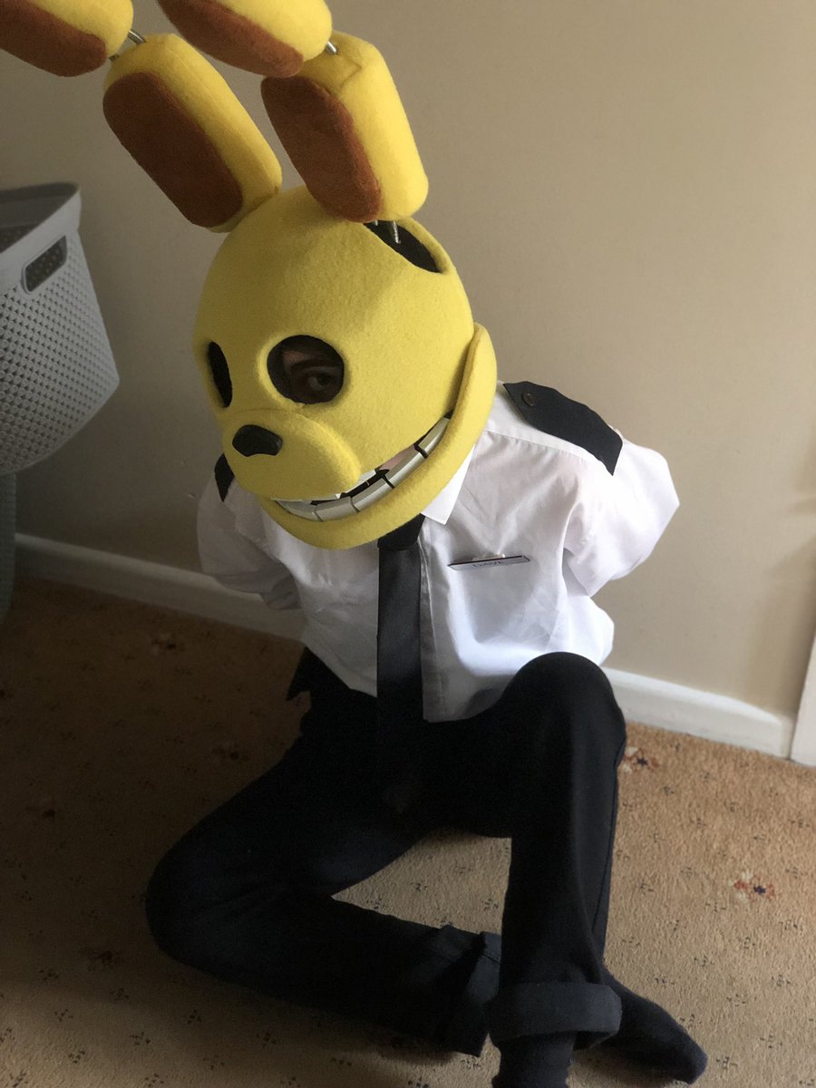 “They’re with me…their happiest day” frl though, got my head from @technifurs today ✨✨ more pics soon! #davemiller #fnafdavemiller #springbonnie #fnaf #FNAF #davemillercosplay #cosplay #Springbonniehead #Williamafton
