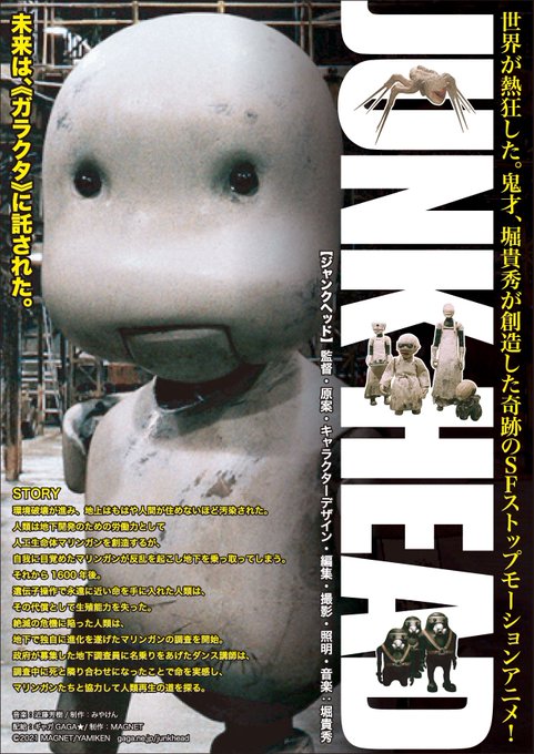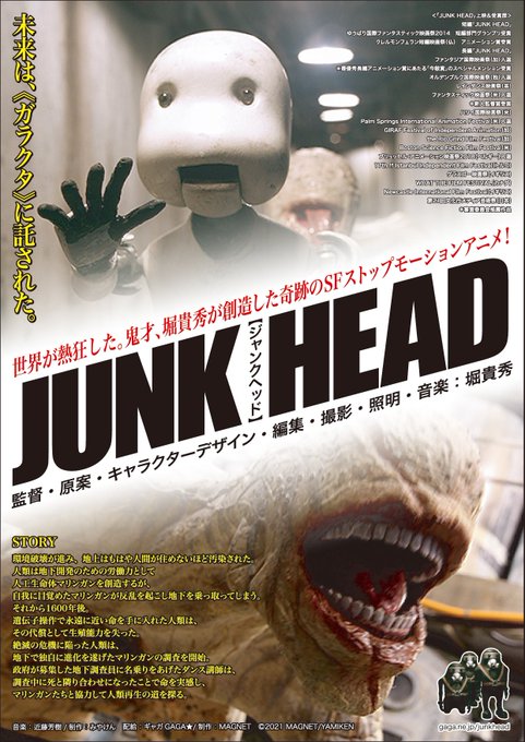 只今、Amazonプライムビデオで絶賛!見放題配信中!の『JUNK HEAD』。 度々ですが、『JUNK HEAD』の創作ポスターの第3弾を作成しました。 静寂的な第1弾と第2弾とは違い、アクション要素を匂わせるデザインにしてみました。 #JUNKHEADファンアート #JUNKHEAD twitter.com/orangepokemori…