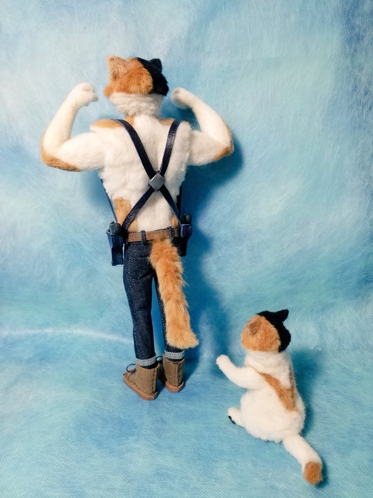 🐈と、父さん! 😺はっ!キット!!! ようやくモッフモフなニャッスル親子が再会が叶いました〜😊 肩車させるにはニャッスルの頭が大きくて😂肩乗りです。公式の絵も肩乗りだったからいいか😁 #FortniteFanArt #ニャッスル親子 #キット #Meowscles