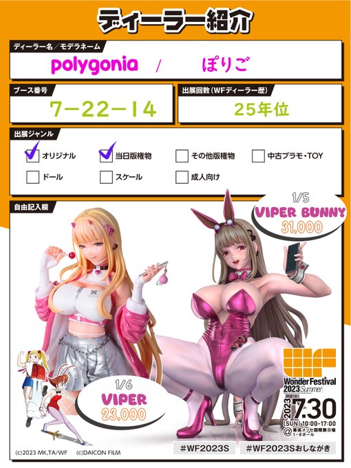 【ワンダーフェスティバル WF2023 Summer】 7-22-14 「polygonia (ポリゴニア)」 ・バイパー 23,000円 ・バイパーバニー 31,000円 *専用水転写デカール付き *いずれも未塗装未組立ガレージキットです *バイパーバニーは一直接販売許可を貰った商品です #WF2023S #WF2023Sおしながき #NIKKE
