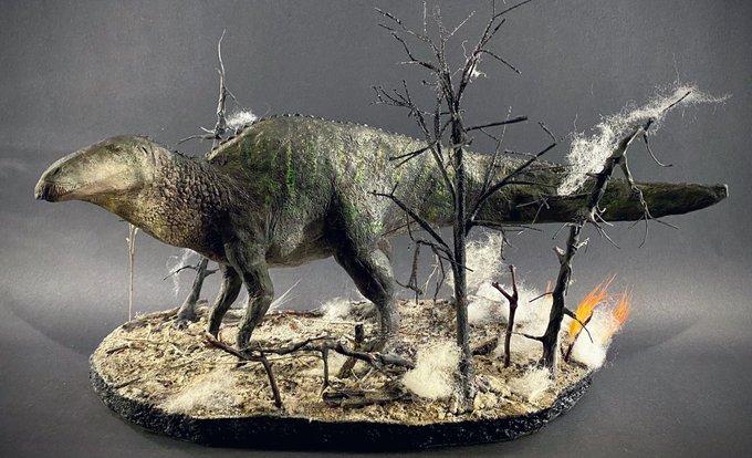 A bull Edmontosaurus stands at the edge of the devastation. He scans for his mates and offspring. While he himself may have been able to endure this disaster, his once prosperous herd appears to have been forever shattered. (detail shots in comments) #paleoart #Sculpture