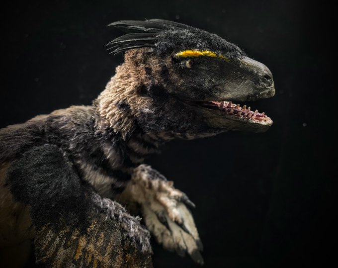 #Austroraptor - Real size bust of a subadult female (60% of the adult size). Epoxy clay, flexible and common air-dry polymeric clay, plastic eyes, synthetic fur, real feathers #paleoart #cretaceous #argentina #patagonia #handsculpted #handmade #handpainted #dinosaur