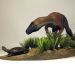 A curious and maybe hungry #Santanaraptor is stalking a tortoise that's in a hurry to return to water. Epoxy clay and artificial plants #paleoarte #paleoart #dinossauro #dinosaurio #dinosaur #handsculpted #handmade #handpainted #brazil #brasil #cretaceous #cretacico #mesozoic