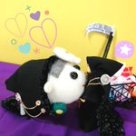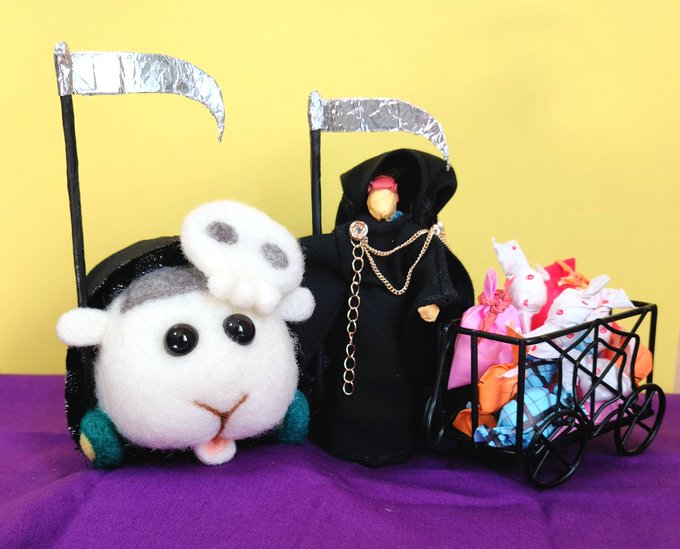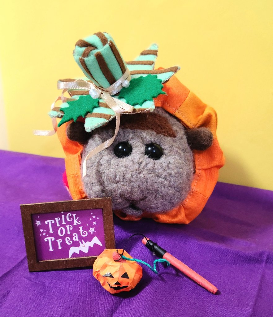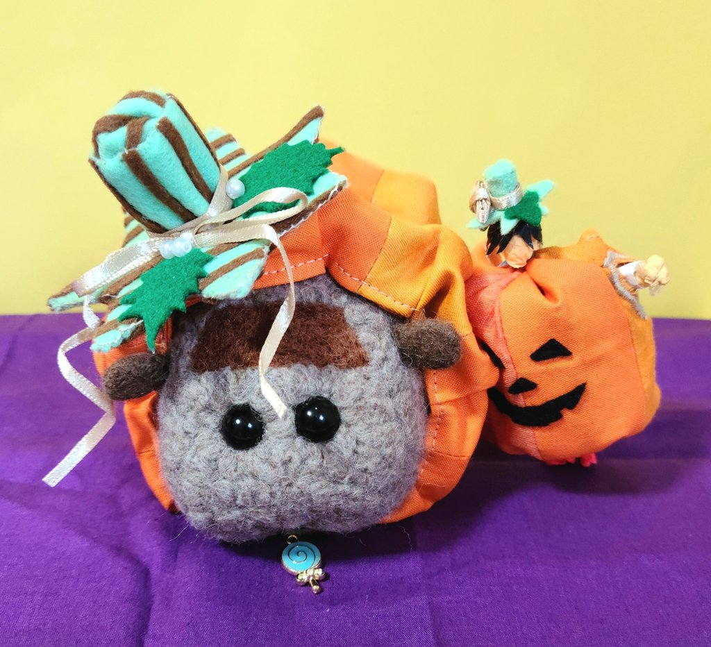 シロモとお兄さんのハロウィン衣装を縫いました☺️🎃お揃いで怖い神様に…💀✨ 今回も、以前作った折り紙お兄さんに服を着せています👔小物は折り紙、羊毛などで作成…✂️ そんなに沢山のお菓子を持ってパーティへ…?!👀🍬🍭 #モルカー #モルカーファンアート #PUIPUIハロウィン